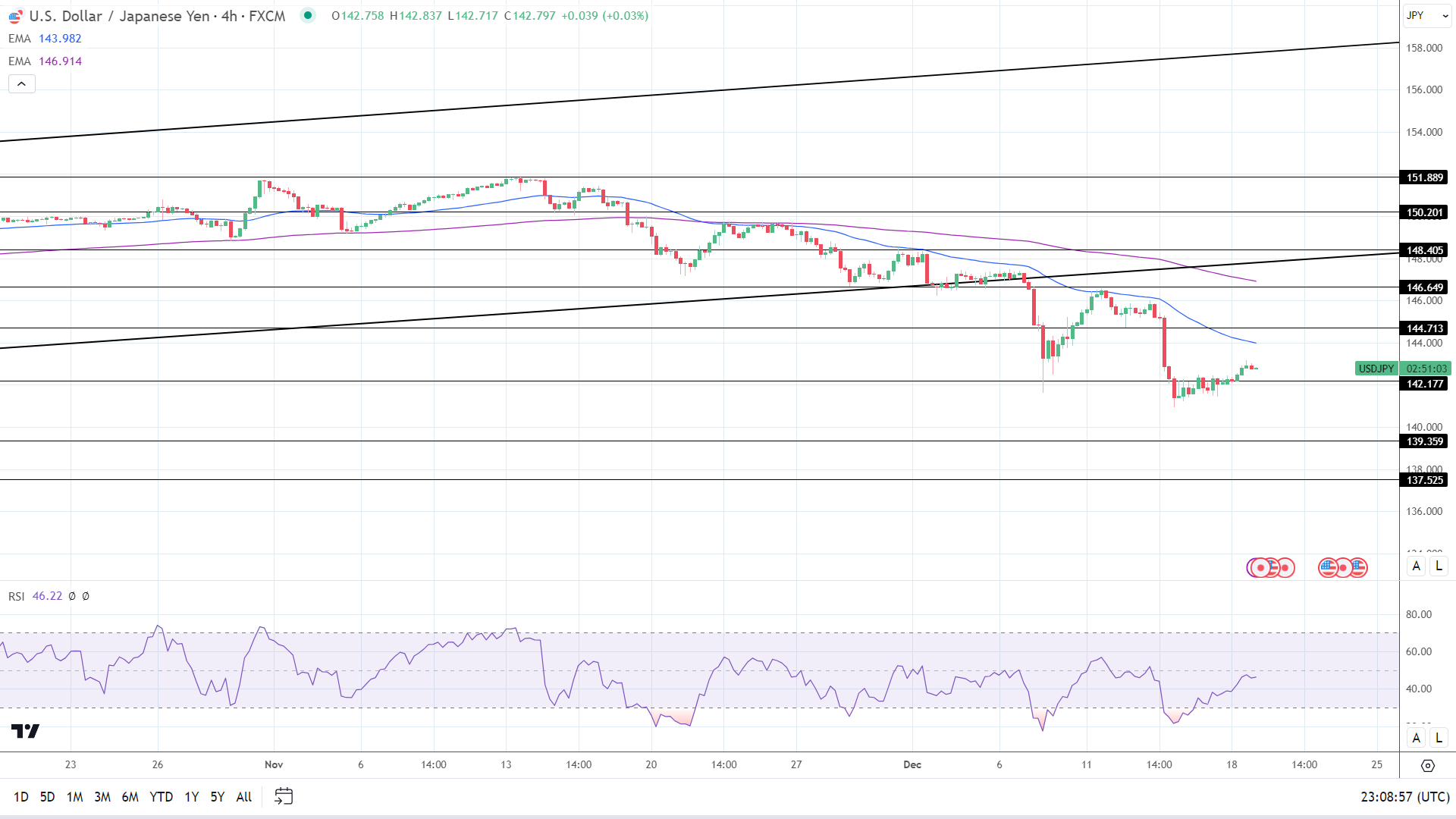 14周期4小时RSI为46.22,表明美元/日元在进入超卖区域之前会跌破142关口。