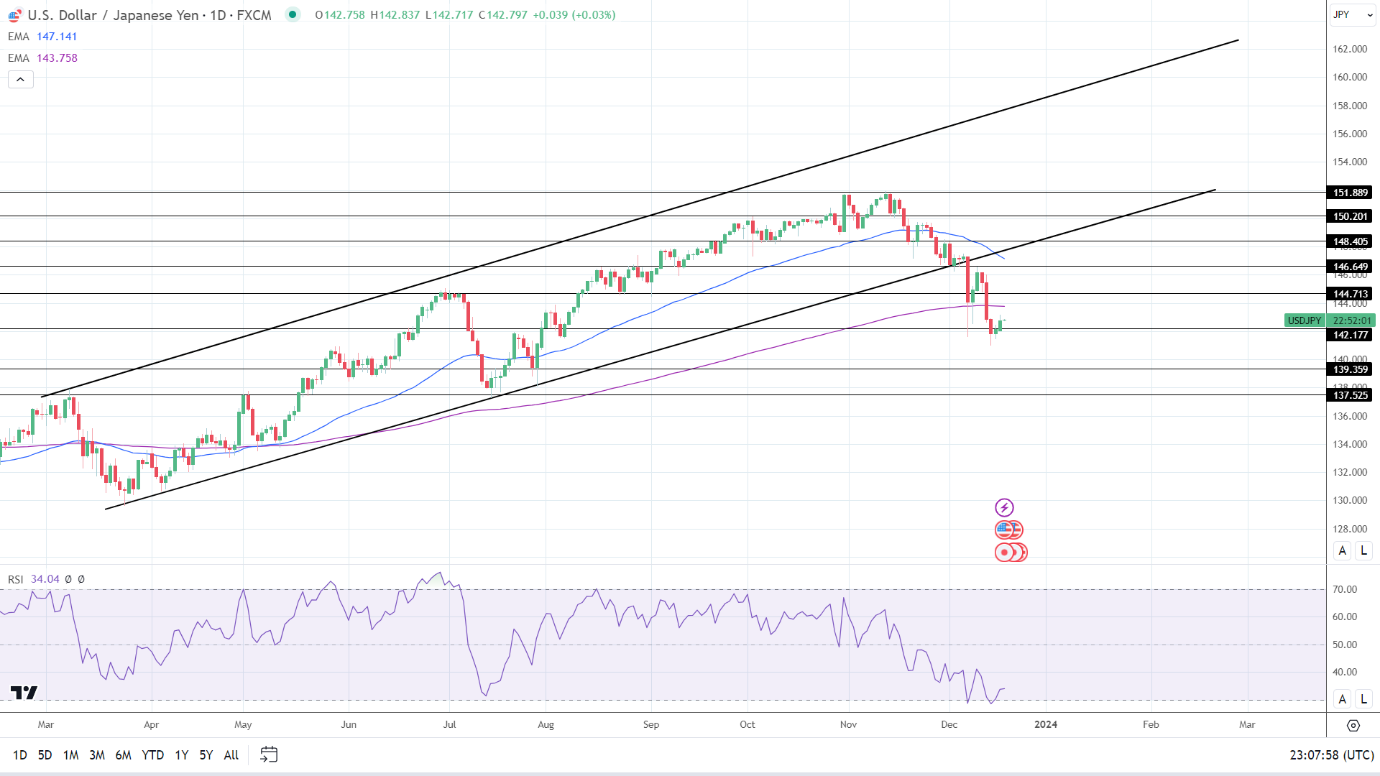 14天RSI为34.04,表明美元/日元在进入超卖区域之前跌破142.177支撑位。