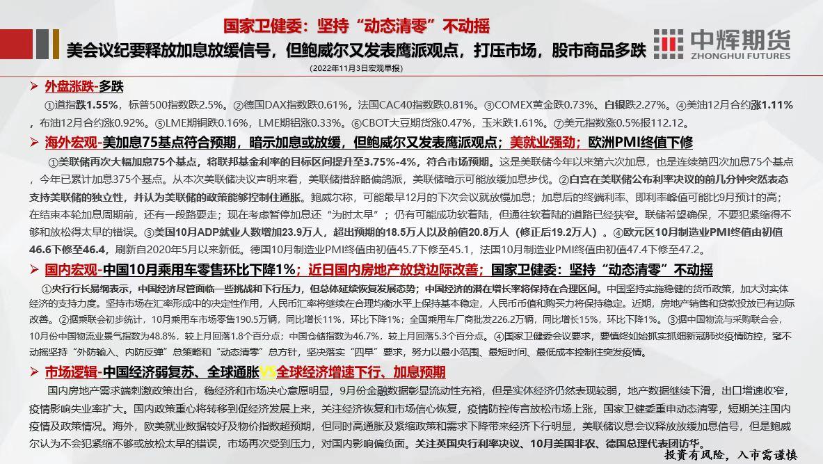 11月3日,中辉期货发布宏观早报,称美联储会议纪要释放加息放缓信号,但鲍威尔又发表鹰派观点,打压市场。未来投资者需关注英国央行利率决议和美国10月非农。
