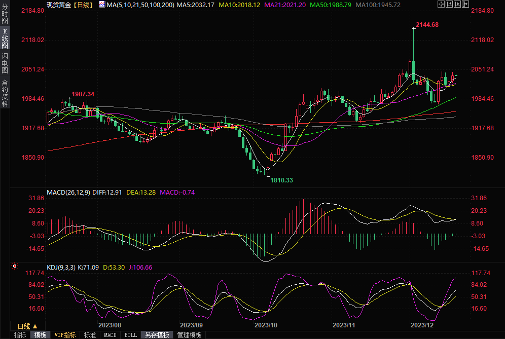现货黄金收涨0.64%,收报2040.15美元/盎司,盘中最高触及2046.86美元/盎司,接近上周四最触及的近两周高点2047.55阻力。