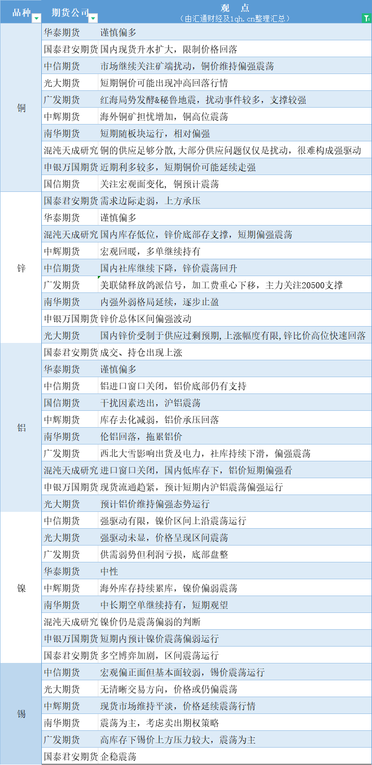 期货公司观点汇总一张图:12月21日有色系(铜、锌、铝、镍、锡等)