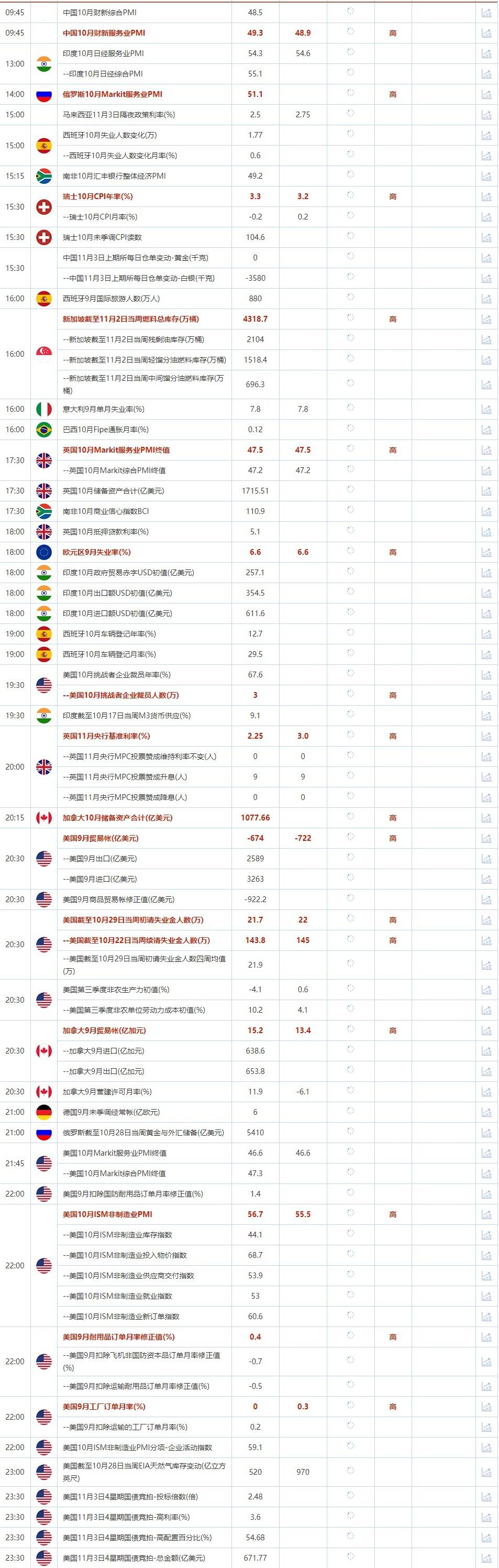 09:45 中国10月财新服务业PMI , 前值 49.3 , 预期值 48.9 , 公布值:待发布13:00 印度10月日经服务业PMI , 前值 54.3 , 预期值 54.6 , 公布值:待发布