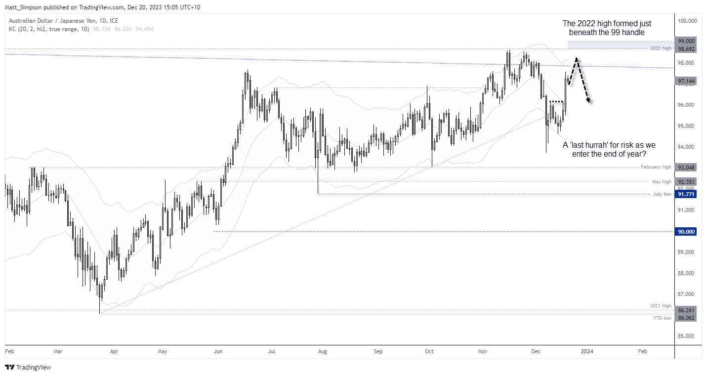 澳元/日元能够轻松创出新高吗?如果圣诞行情能够延续,那么澳元/日元可能测试2022年的高点(98.54附近),但突破99附近阻力非常困难。对本月剩余时间可持谨慎看涨态度,一旦在这些高点附近出现熊市动能转移的迹象(如出现空头吞噬线),可迅速平仓。