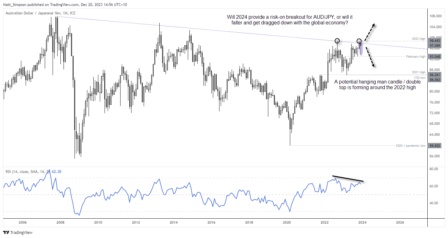 从月线来看,明年澳元/日元是否上破2022年高点?或者我们是否已经看到双顶的早期阶段?如果美国股市明年延续涨势,全球经济没有出现任何形式的硬着陆,通胀得到抑制,那么澳元/日元可能上破;如果全球经济低迷,全球经济进入衰退期,那么澳元/美元可能从关键阻力位回落,至少会产生一个深度回调。
