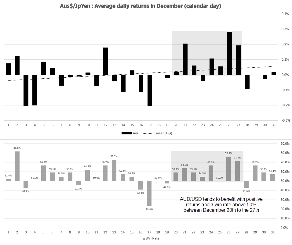 观察12月份的平均日回报率可以发现,澳元/日元在12月20日至12月30日期间超过50%时间上涨。最值得注意的是节礼日,平均正回报最高,胜率第二高,为76.2%。