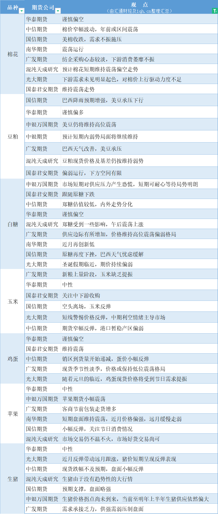 标题:期货公司观点汇总一张图:12月22日农产品(棉花、豆粕、白糖、玉米、鸡蛋、生猪等)