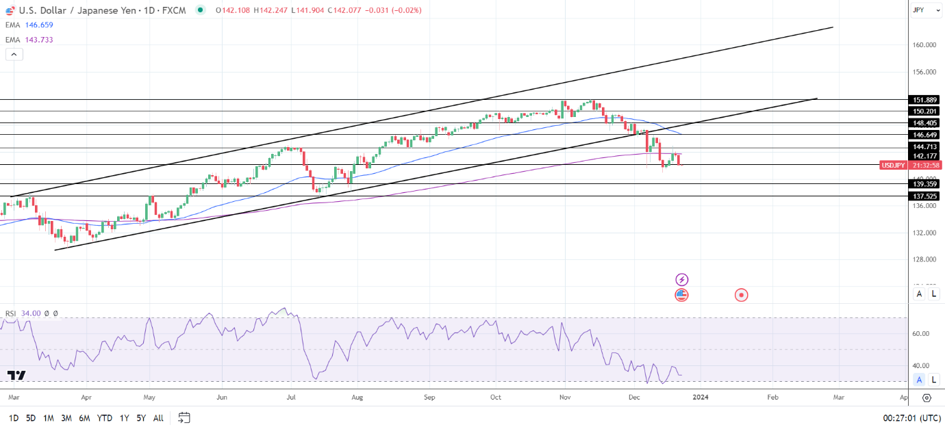 14天RSI为34.00,表明美元/日元在进入超卖区域之前将跌破141.500关口。