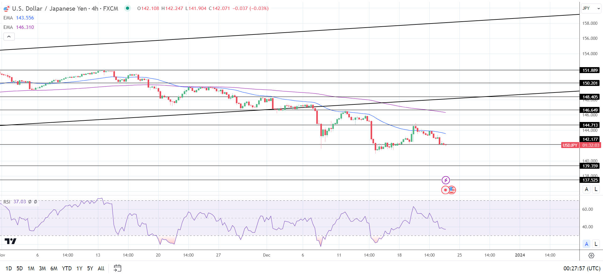 14周期4小时RSI为37.03,表明美元/日元在进入超卖区域之前跌至141.500关口。