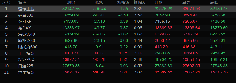 标普500指数下跌2.50%,至3759.69点;纳斯达克指数下跌3.36%,至10524.80。