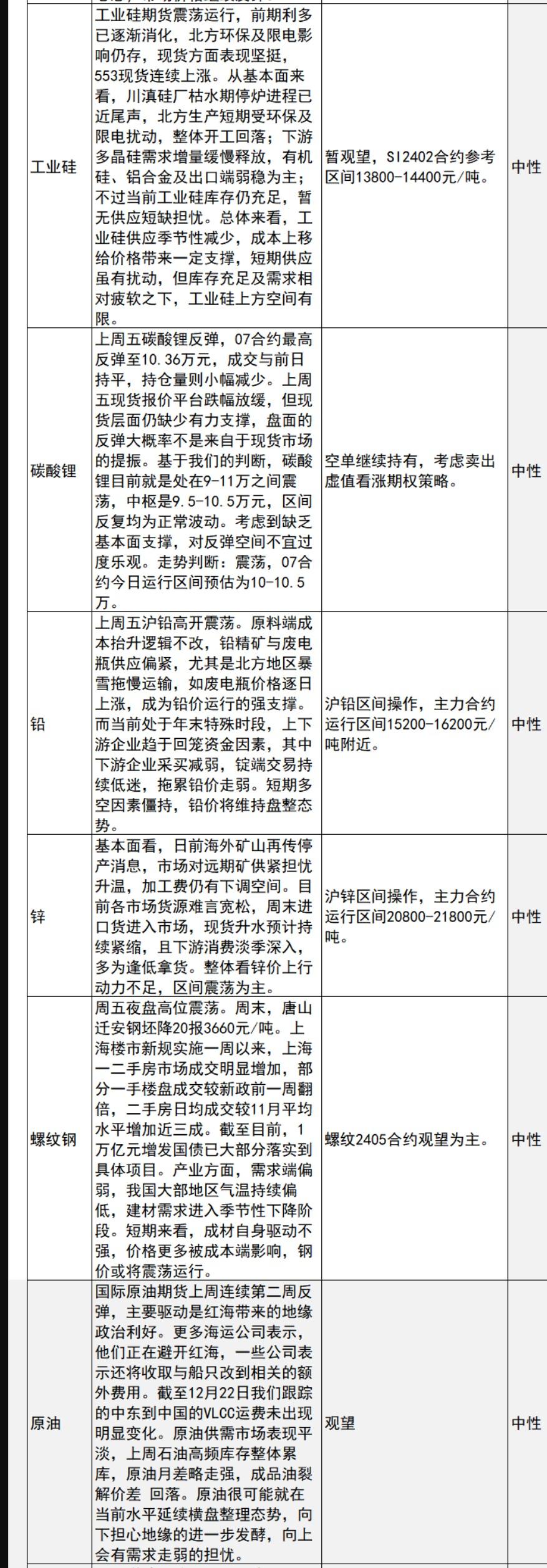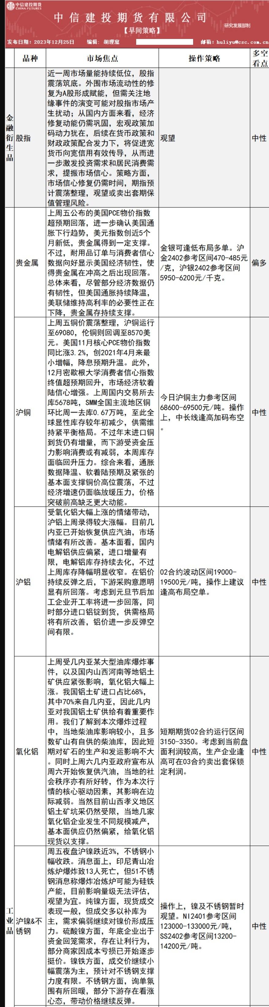 以下为中信建投期货12月25日对股指、贵金属、能源化工、黑色建材、有色金属、农产品期货交易提醒和建议。