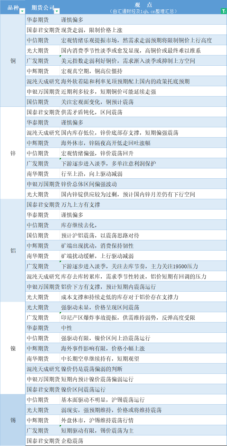 期货公司观点汇总一张图:12月26日有色系(铜、锌、铝、镍、锡等)