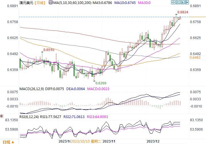 周一(12月25日),由于是西方的圣诞假日,澳元/美元走势平静,收盘维持在0.68附近。上周五公布的11月美国物价环比下降,为三年半以来首次,这推动同比涨幅在3%以下进一步放缓,这提振了金融市场对美联储将在明年3月降息的预期。通胀降温令很多美国民众信心增强,上周五密西根大学发布的报告显示,12月消费者信心指数急升,抹去了前四个月的所有跌幅。为此,美国股市上涨。美元兑一篮子货币下跌。这也间接刺激了风险偏好情绪的上升,澳元/美元维持住了近期的升幅,汇价也是稳踞近期的高位。从日线图上观察,澳元/美元仍位于波林格上行趋势通道内,通道底部上抬,目前初步支撑位于0.6759,若能进一步上行,多头将看向7月高点0.6895。