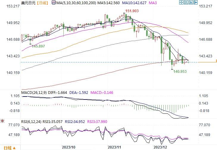 周一(12月25日),适逢西方圣诞长假,外汇市场极为清淡,美元/日元收盘与上日持平,目前交投于142.10-57之间。日本央行总裁植田和男周一表示,实现央行通胀目标的可能性正在“逐步上升”,如果持续实现2%目标的前景“充分”上升,央行将考虑改变政策。其措辞与他惯常呼吁暂时需要“耐心地”维持超宽松政策的说法略有不同。日本公债市场对植田和男的讲话并未多加理会,公债收益率下跌。但是,由于通胀率超过目标已有一年多时间,许多市场人士预计日本央行将在明年提高短期利率,使其脱离负值区域,有些人甚至押注最早在1月就会提高利率。日元的走势正纠结在日本央行改变利率政策的时点上。若日本央行还是拖延不能明确结束负利率的时间表,那短期内料对日元不利。而一旦日本央行开启紧缩的举动,日元的升势及幅度料将是可观的。日线图上,观察是否会进入短线的旗形整理状态,整理的区间集中在141.80-143.00之间。