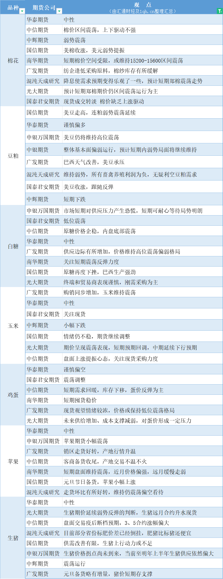 标题:期货公司观点汇总一张图:12月27日农产品(棉花、豆粕、白糖、玉米、鸡蛋、生猪等)