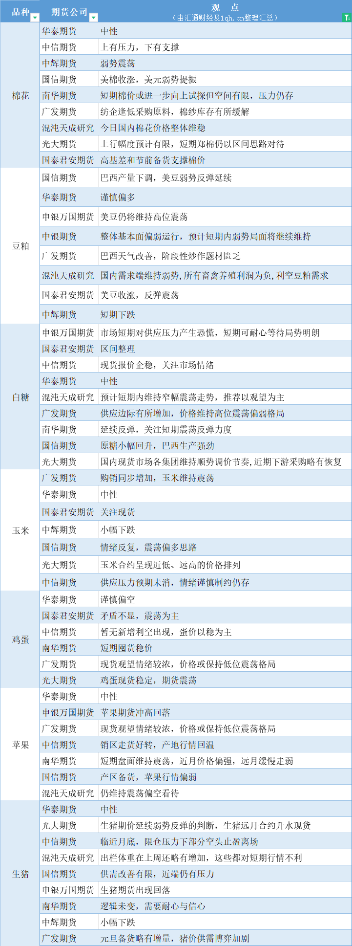 标题:期货公司观点汇总一张图:12月28日农产品(棉花、豆粕、白糖、玉米、鸡蛋、生猪等)
