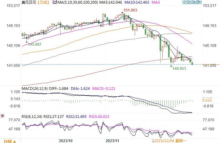 美元兑日元也下跌0.35% 至141.89。年低美元的这波走低,主要是因市场预期美联储可能很快降息。美联储主席鲍威尔在12月会议上出人意料地表现出鸽派态度后,市场对联储3月降息的预期升温,当时决策者预计2024年将降息75个基点。而包括欧洲央行在内的其他主要央行则保持了维持较高利率更久的立场。与此同时,日本央行也表示,更接近于结束负利率政策,尽管坚称并不急于做出调整。日本央行周三表示,将在1-3月季度的常规操作中减少债券购买量。日本央行12月18-19日会议的意见摘要也显示,日本央行决策者认为目前有必要维持超宽松货币政策,一些决策者呼吁就未来退出大规模刺激政策进行更深入的讨论。种种迹象表明,日本央行似乎已开始做出结束负利率的准备。日内将有日本工业生产和零售销售数据公布,留意数据对日元的影响。日线图上,经旗形整理后,美元/日元延续下行,若前期低位140.95失守,汇价降有望下探140-138区域。上方目前在145之下有着较强的阻力。