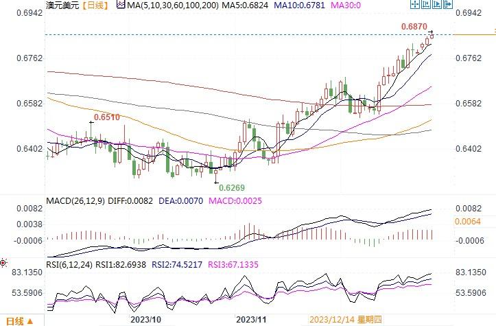 周三(12月27日),澳元/美元盘初触及五个多月最高0.6851,纽约尾盘最终上涨0.21%,报0.6841。对美国将积极降息的预期提振了风险偏好和大宗商品,同时也使债券保持良好买盘。鉴于最新的美国通胀报告数据温和,期货市场暗示美联储有80%的可能性会在3月降息,预计2024年全年降息幅度将达到152个基点。高盛目前预计,美联储将在3月、5月和6月连续三次降息25个基点,之后每季度降息一次,直到联邦基金利率区间达到3.25-3.5%。而澳洲的货币利率松缓时间表预期要晚于美联储,息差优势给到澳元支持。此外,铁矿石价格飙升至每吨140美元的18个月新高,也为澳元提供了支撑。日线图上,澳元/美元有加速上行的态势,布林带通道喇叭口扩张,技术指标强力上扬,显示澳元多头保持强势。进一步上行目标将瞄向0.70,下方的支撑点位则开始逐级抬升。