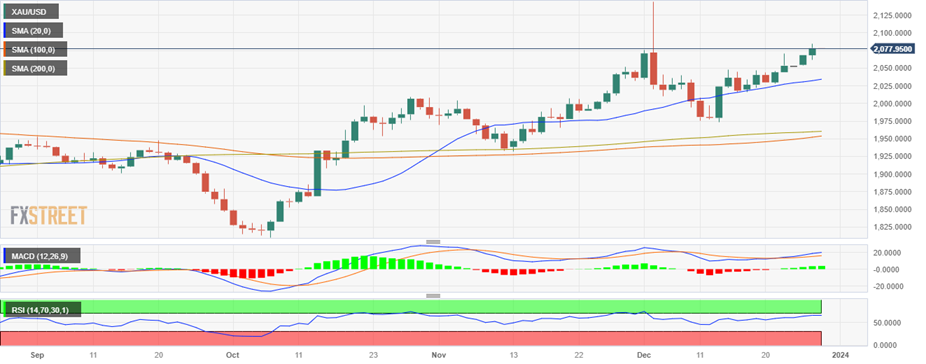 汇通财经APP讯——周四(12月28日)亚市盘中,现货黄金短线突然快速上升近10美元,金价最新位于2088美元/盎司附近,此前刷新近三周高点至2087.71美元/盎司。。FXStreet分析师Patricio Martín撰文,对金价技术前景进行分析。