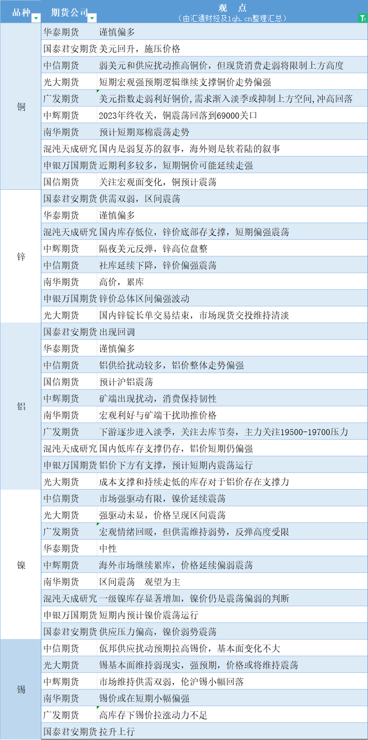 标题:期货公司观点汇总一张图:12月29日有色系(铜、锌、铝、镍、锡等)