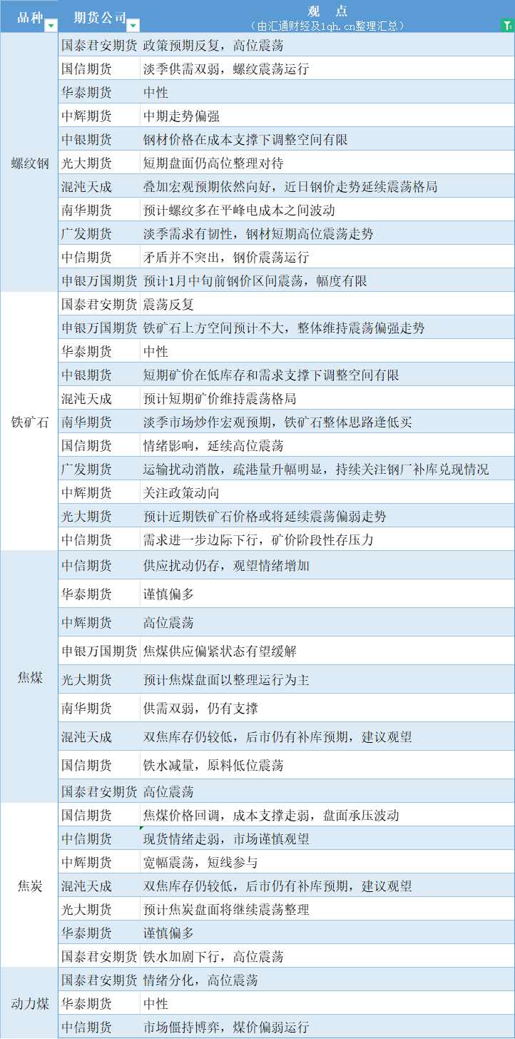 期货公司观点汇总一张图:12月29日黑色系(螺纹钢、焦煤、焦炭、铁矿石、动力煤等)