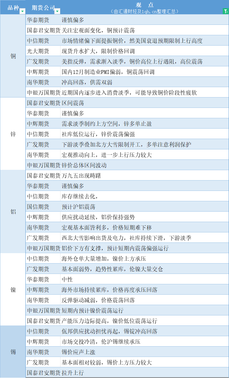 标题:期货公司观点汇总一张图:1月2日有色系(铜、锌、铝、镍、锡等)