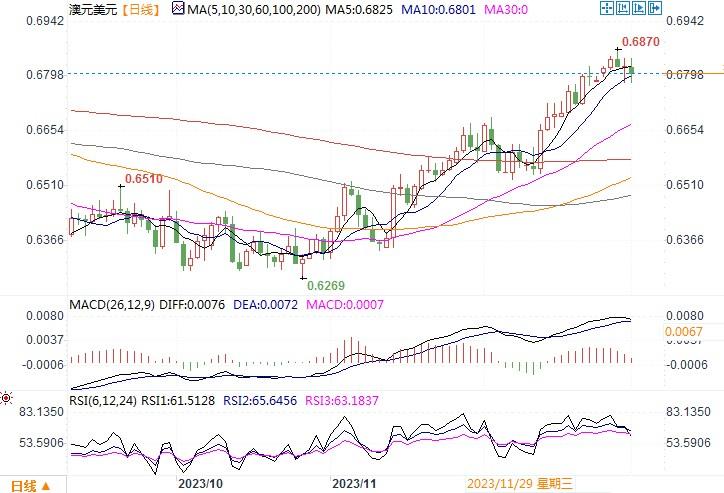 周一(1月1日),澳元/美元从高点0.6871处略出现下跌至0.6811。虽然澳洲央行在本月早些时候积极考虑加息,但目前的期货暗示,市场认为其几乎不可能升息,反而预期央行6月降息25个基点的机率为100%。在四大本地银行中,澳新银行、澳洲联邦银行和西太平洋银行认为澳洲央行已经完成了紧缩周期,只有澳洲国民银行仍坚持预期2月将再加息一次。澳元接下来将面临的主要数据是1月15日的澳洲11月消费者物价和1月31日的第四季度通胀报告。大多数分析师认为,若要使澳洲央行在2月加息,这两个数据都必须出人意料地高。而数据反映的通胀情况若是呈下降境况,势必进一步打消央行加息的预期,那么澳元/美元做进一步的高位回落调整也属正常。日线图上观察,澳元/美元在0.69水平附近遇阻出现调整回落走势,技术指标MACD有形成高位死叉迹象,RSI在超卖临界线平移,显示澳元的上升走势动能出现顿挫。短线须继续防范澳元调整回落风险为主。下方留意0.6760-0.6720区域的支撑力度,若跌穿则须谨慎防范走向趋势的逆转。