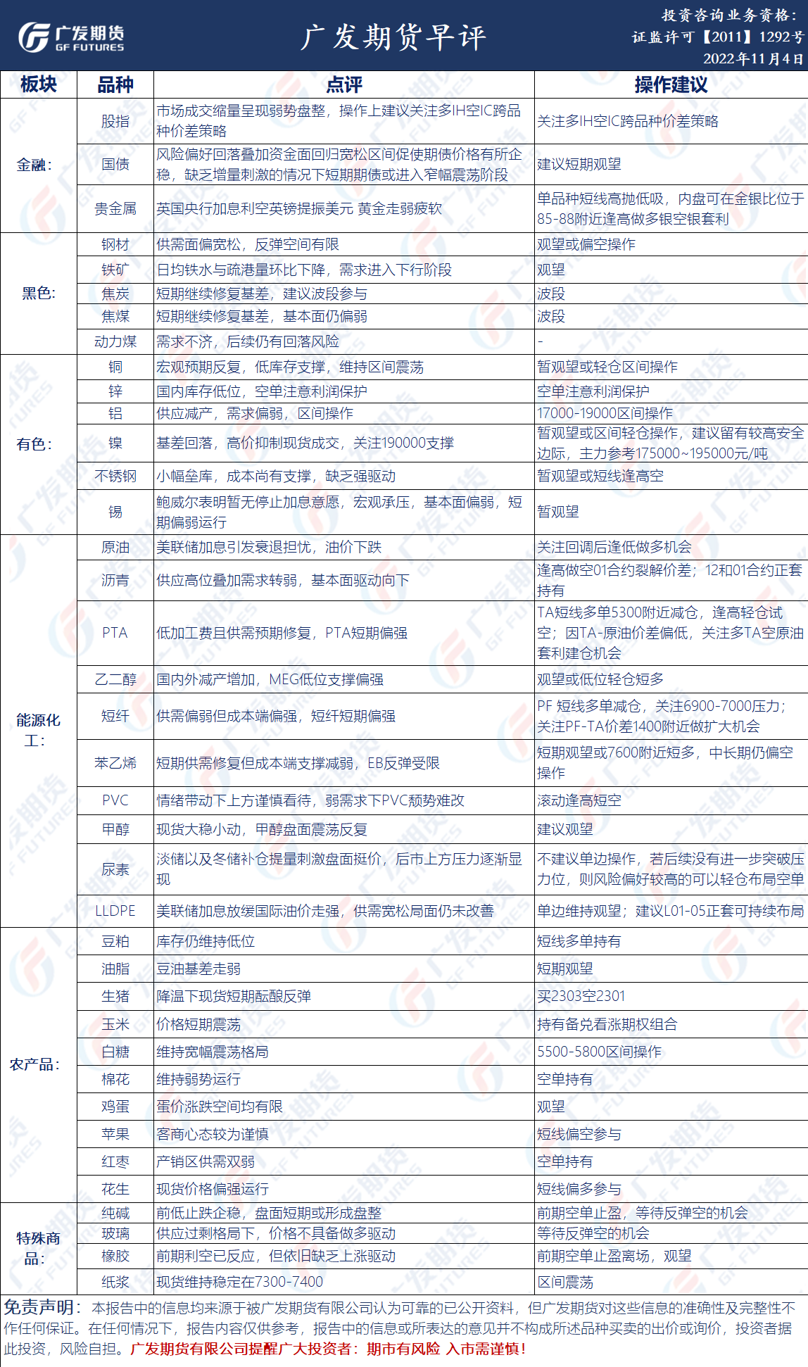 广发期货发布11月4日早评,就国债期货、贵金属、有色金属、黑色金属、农产品、能源化工和特殊商品的基本面给出描述,给出操作建议。建议钢材观望或偏空操作,贵金属单品种高抛低吸,原油关注回调后逢低做多机会。