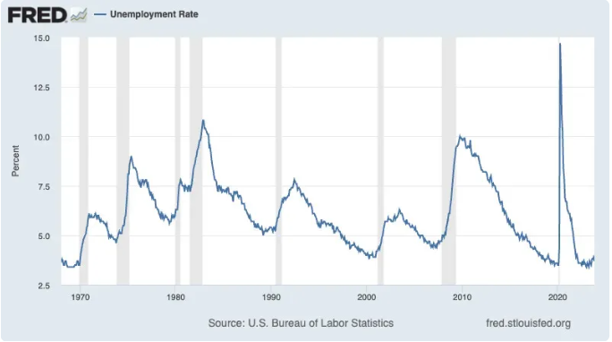 (图:美国失业率变化一览,目前为3.7%,接近50年来的最低水平)