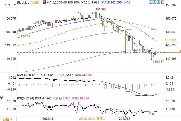 美元指数在2023年下跌2%,结束了两年来的涨势,因投资者预期美联储年将大幅降息。虽然在上月美联储暗示将在2024年降息后美元承压,但有机构的分析表示,“市场逐渐认识到美国经济依然强劲”,而且今年可能保持强劲。因此,美联储是否真能如市场预期那般进入降息阶段,仍需做进一步的观察。投资者本周将看到多项经济数据,包括欧洲通胀数据、美国职位空缺和非农就业数据,这些数据将影响市场对美联储和欧洲央行货币政策动向的预期。美联储制定利率的联邦公开市场委员会(FOMC)将在周三公布12月会议记录,这将让人们进一步了解决策者对降息可能性的看法。若各方面显示,美联储尚不必要及早降息,那么美元势必将会进一步自上年的的低位进行反弹。日线图上,技术指标平滑异同移动平均线MACD的信号线出现死叉,相对强弱指数RSI也出现转向的迹象,表明美元/日元在140水平的支撑较为强韧。上方的初步阻力在143附近,若上穿,进一步将考验145的阻力情况。近期以防范美元反弹风险为主。
