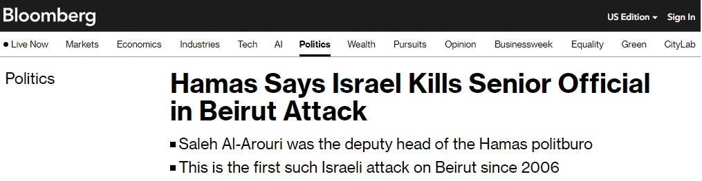 虽然以色列政府还没有证实它是这次袭击的幕后主使,但黎巴嫩国营的国家通讯社说,一架以色列无人机袭击了贝鲁特南郊哈马斯办公室所在的公寓楼,造成包括阿鲁里在内的6人死亡。如果得到证实,这将是以色列近20年来首次对黎巴嫩首都发动此类袭击。