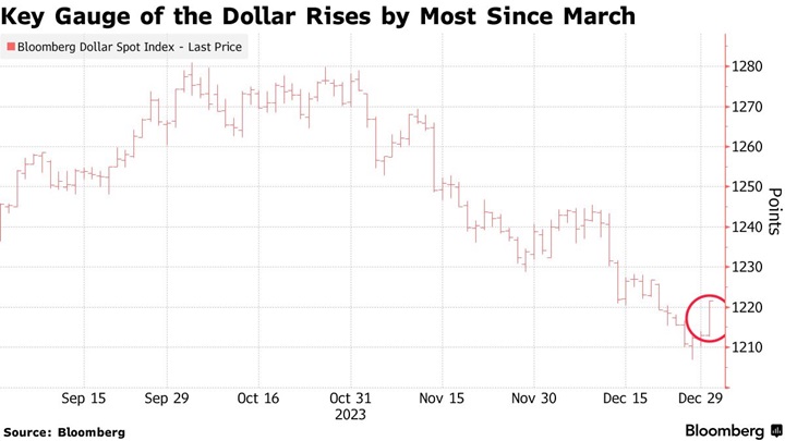 受美债收益率走高以及市场避险需求推动,美元在2024年第一个交易日创下去年3月以来的最大单日涨幅。