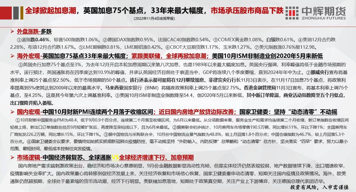 11月4日,中辉期货发布宏观早报,称全球处于最紧缩的货币流动潮,经济下行明显。美联储加息落地,短期处于政策真空期,关注产业上下游博弈。