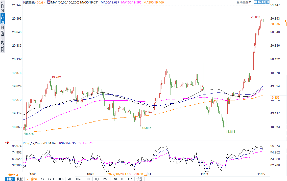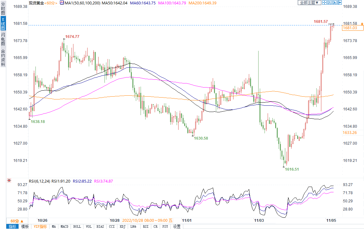 周五(11月3日)黄金上涨3.17%,报收1681.03美元/盎司;白银暴拉7.07%,报20.83美元/盎司。早前美国里士满和波士顿的联储主席纷纷暗示美联储之后的加息行动可能放缓;与此同时,数据显示美国10月失业率上升,使投资者预期美联储未来将软化激进加息的立场,支撑金价大幅上涨。
