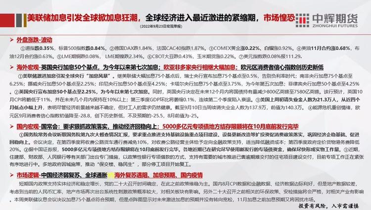 中辉期货宏观早报:美联储加息引发全球掀加息狂潮,全球经济进入最近激进的紧缩期,市场惶恐