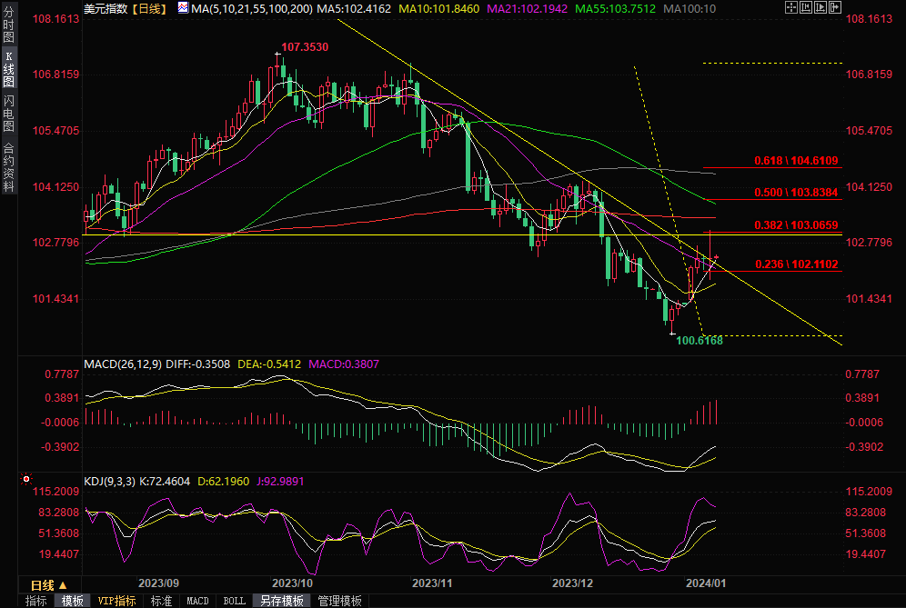 美元指数自周初的101.35附近持续攀升,最高触及103.03水平,上周五大起大落最终收于102.439,当周整体上涨超100点,涨幅超过1%,结束此前连续三周下跌的趋势。