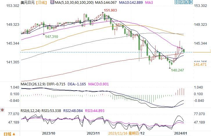 美元兑日元有所下跌,至收盘阶段跌0.35%,报144.10。上周五的非农就业报告可谓喜忧参半。整体读数无疑是相当高且不错的,但许多分项指标也显示出劳动力市场的一些领域的疲态更加严重。因此投资者继续消化上周喜忧参半的美国经济数据,并等待从本周关键的通胀数据中寻找美联储可能何时开始降息的新线索。根据芝商所(CME)的FedWatch工具,交易员目前认为3月降息的概率为64%,低于一周前认为的89%。今年,在欧美各主要央行都被预期降息之际,日本央行却有所不同,或将加息,使利率升至正值区域,但其利率很可能仍低于全球其他主要央行。在上周日本能登半岛西部发生7.6级地震后,加息时间也可能推迟。况且,由于此前日元的回升已提前对加息预期进行了消化,即便日本央行果真有加息举动,料对日元的刺激作用也不会太大。日线图上,美元/日元短线继续处在冲高回调之中,技术指标向上延摆趋向未变,显示美元多头暂时未有退去的迹象。继续留意下方143附近的支撑,若跌破,美元上升势头将发生逆转。不破,则存在继续升高的趋向。