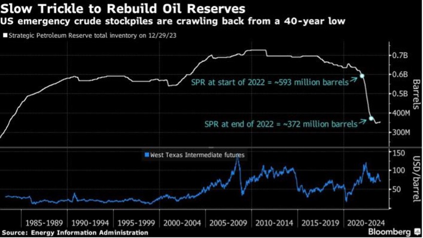 美国能源部正在缓慢地重新填充战略石油储备,该储备在2022年被耗尽,此前拜登政府为了抑制俄乌冲突后的高油价,作出了历史性的释放1.8亿桶石油的决定。根据能源信息署的数据,世界上最大的紧急供应储备目前约为3.544亿桶。但随着美国西德克萨斯中质原油期货因中东紧张局势而上涨,或造成价格上涨过高而阻碍补给。美国在2022年以每桶大约95美元的价格出售了数百万桶原油,而后以平均每桶75美元的价格购买原油以补充战略石油储备。美国西德克萨斯中质原油上周以每桶73.81美元的价格结算。