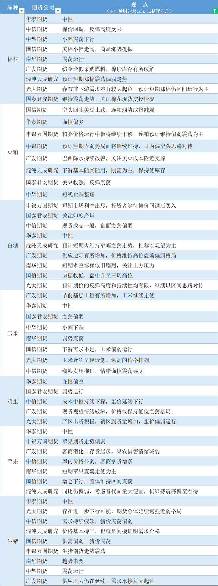 标题:期货公司观点汇总一张图:1月10日农产品(棉花、豆粕、白糖、玉米、鸡蛋、生猪等)