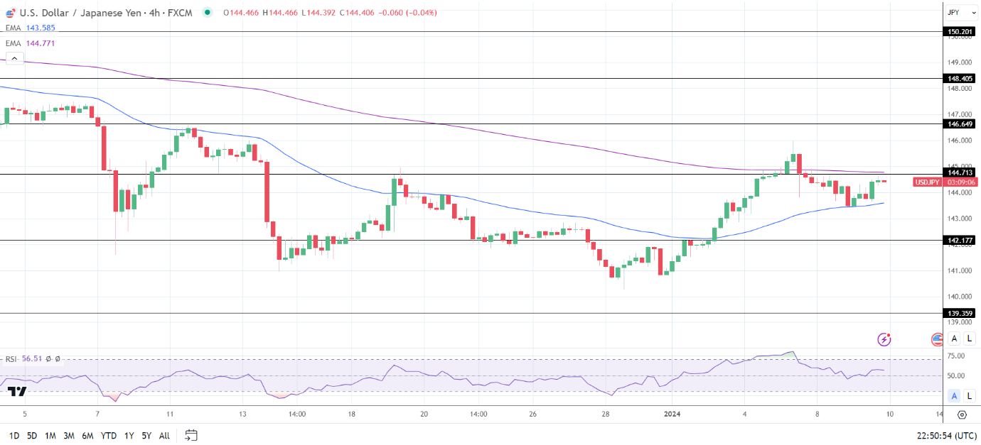 14周期4小时RSI为56.51,表明美元/日元在进入超买区域之前将回到146关口。