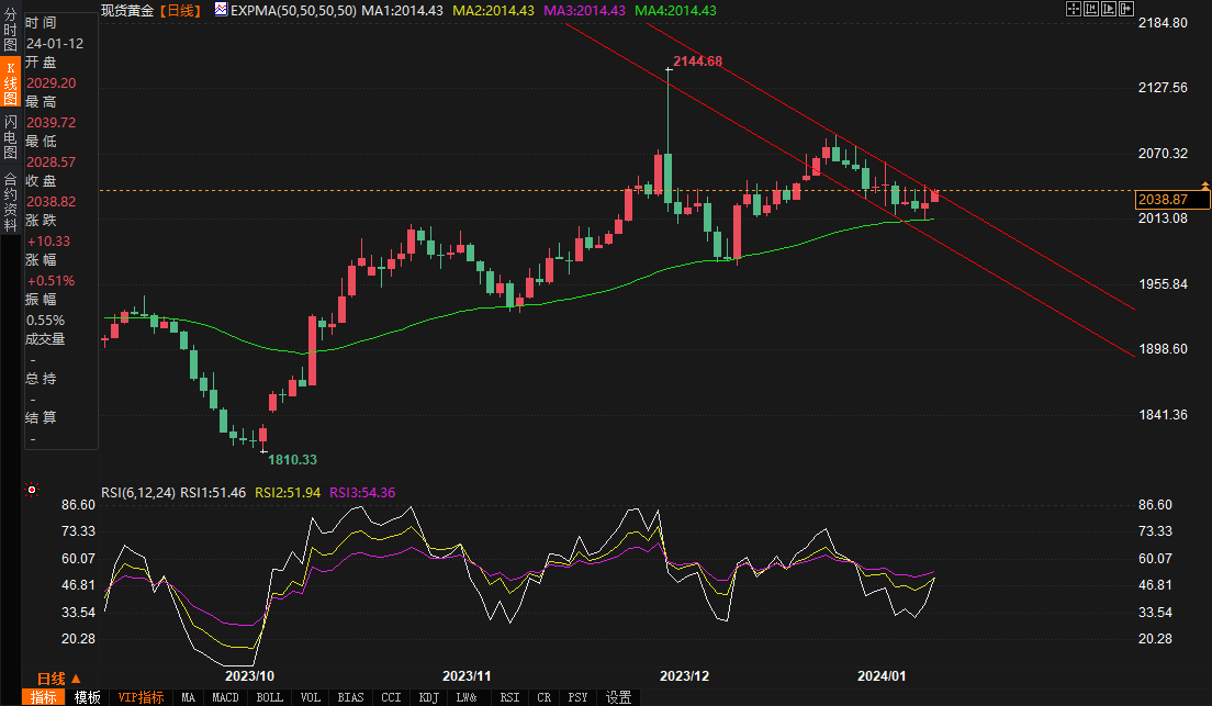 现货黄金震荡走高,盘中报2038.29美元/盎司,涨0.48%。
