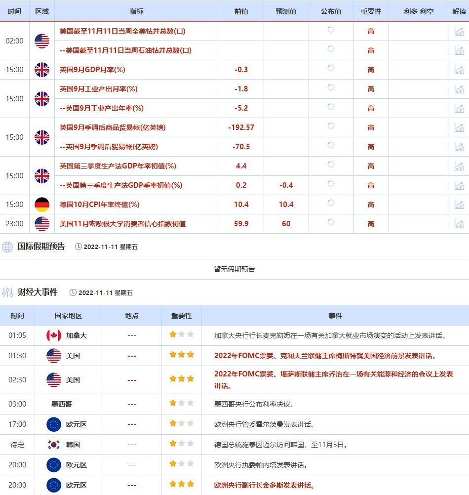 11月11日,克利夫兰联储主席梅斯特就美国经济前景发表讲话,堪萨斯联储主席乔治在一场有关能源和经济的会议上发表讲话。此外,欧洲央行副行长金多斯发表讲话。投资者需关注他们的最新观点。