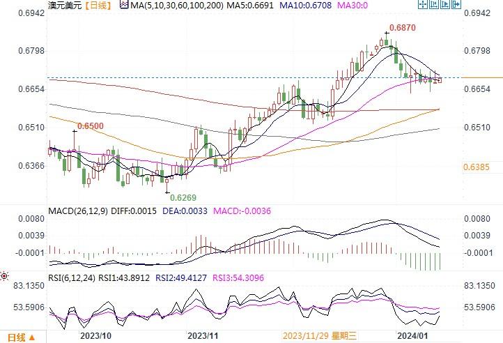 澳元兑美元变化不大,收盘报0.6687。在美联储公布低于预期增长的PPI生产价格指数之后,FedWatch联邦观察工具预期3月降息的可能性从周四的73%上升为79%,而且当日美国短期公债收益率则大跌10个基点。于此同时,在欧洲央行总裁拉加德的鸽派言论强化了该央行最早将于4月降息的预期后,澳元兑欧元也短暂触及一个月高点。相对照的是,市场认为澳洲央行将更晚采取行动,利率期货暗示澳联储2024年全年降息幅度将为50个基点,而美联储为155个基点。未来利率走向的分化和差异,暂时给到了澳元一些支撑。然而,澳洲上周公布的澳洲11月消费者物价数据意外弱于预期,暗示第四季通胀率也将低于澳洲央行的预测。有著名机构为此体出分析意见认为澳洲央行今年下调利率的幅度可能会超过市场目前的预期。因此,澳元/美元似乎也未能产生更大的反弹动能。日线图上, 日线动量指标缓和,布林带区间持平,信号混杂没有明确倾向。久经考验的10月/12月上涨走势的38.2%回档位0.6641是关键支撑位,上周高点0.6734和随后的21日均线0.6753是重要阻力位。