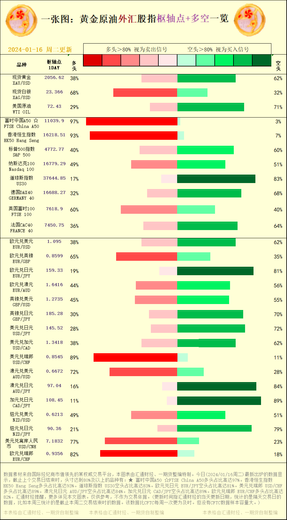 标题:一张图:2024/01/16黄金原油外汇股指"枢纽点+多空占比"一览