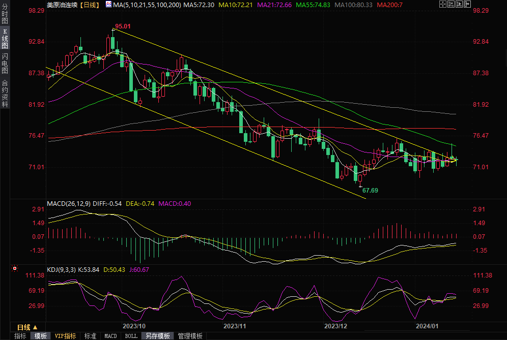 由于美国假期,美国西得克萨斯中质原油没有结算价,但收盘下跌0.32%,收报 72.47美元/桶,全天在10日均线附近震荡。