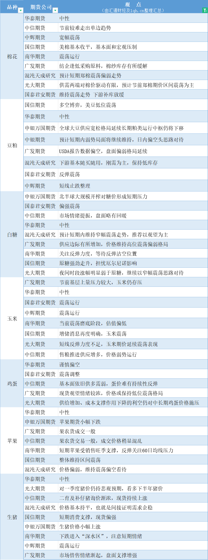 标题:期货公司观点汇总一张图:1月17日农产品(棉花、豆粕、白糖、玉米、鸡蛋、生猪等)