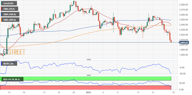 Bednarik补充道,短期内,黄金看跌势头变得更为强劲。4小时走势图显示,金价交投在其所有移动平均线下方,缓慢获得下行牵引力。200周期SMA在2037.25美元/盎司附近提供动态阻力位。此外,技术指标维持在超卖读数附近的下行压力,支持金价跌破2000美元/盎司关口。