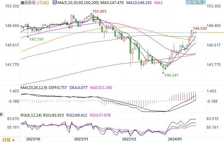 美元兑日元基本持平,收盘在148.14,周三曾升至148.52,为11月28日以来最高。美国劳工部周四表示,在截至1月13日当周,初请失业金人数减少了1.6万,经季节性调整后为18.7万,为2022年9月以来的最低水平,低于接受路透调查的经济学家预期的20.7万。超预期良好的失业数据,使美联储降息的预期进一步受到抑制。此外,包括美联储理事沃勒在内的美联储官员本周反驳了美联储将进行一轮激进降息的预期,暗示降息的时间将比市场参与者最初预计的晚,速度比市场预期慢。美元也是因此受到较大的抬捧而走升。日本央行定于下周一和周二召开政策会议,市场预计可能会维持超宽松货币政策不变。本周剩余交易日里,交易员暂时持盘等待着会议的结果。若日本央行果真维持宽松不变,料日元兑美元将继续走弱。日线图上,美元/日元走势斜率过陡,短线或有调整的变化。而一旦企稳147-148区域,那么上方则有望攻击150水平。