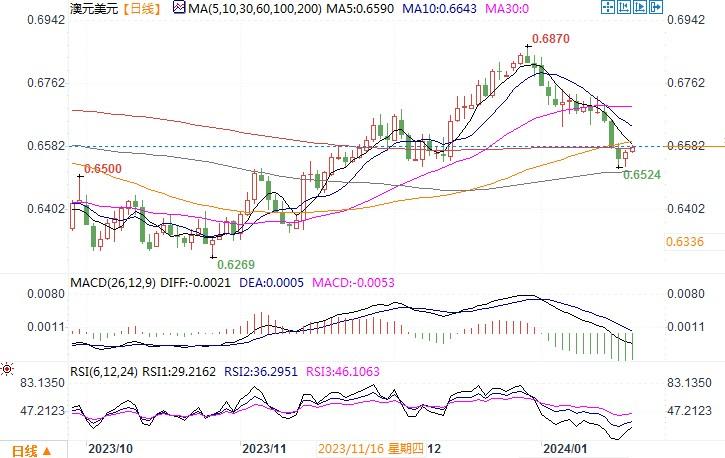 周四(1月18日),澳元/美元收盘涨0.35%报0.6570,因风险偏好、股市和大宗商品攀升,令近期大幅下滑的澳元稍稍得到喘息。但是,澳洲的就业数据显示,12月份就业人数锐减65,100人,结束前两个月令人意外的强劲增长势头,与预期的增加17,600人相差甚远。澳洲劳动力市场这种松动应该会缓解澳洲央行对薪资增长的担忧,并使其不太可能在2月份的政策会议上再次加息。澳洲国民银行本周放弃了对澳洲央行下月加息的预期,并和其他三大本地银行一样,也预测央行紧缩周期已经结束。就经济数据、各主要央行年内是否进入降息以及降息时点和幅度这些影响汇率走势因素来看,当前似乎都不太有利于澳元。目前,小时线上,澳元/美元进入超卖空头回补调整走势状态。而在日线图上,维持着看跌倾向,下方0.6520处在勉力提供着支撑,一旦跌穿,下滑空间将会进一步延展。上方0.6670附近构成初步的阻力。