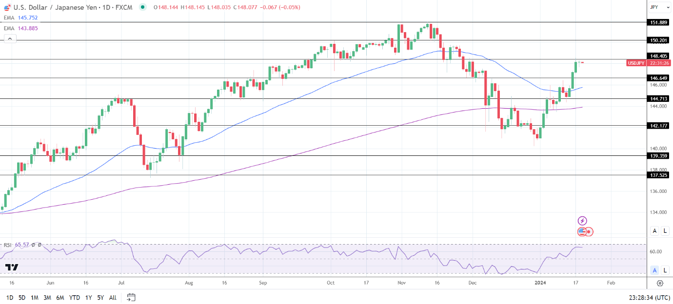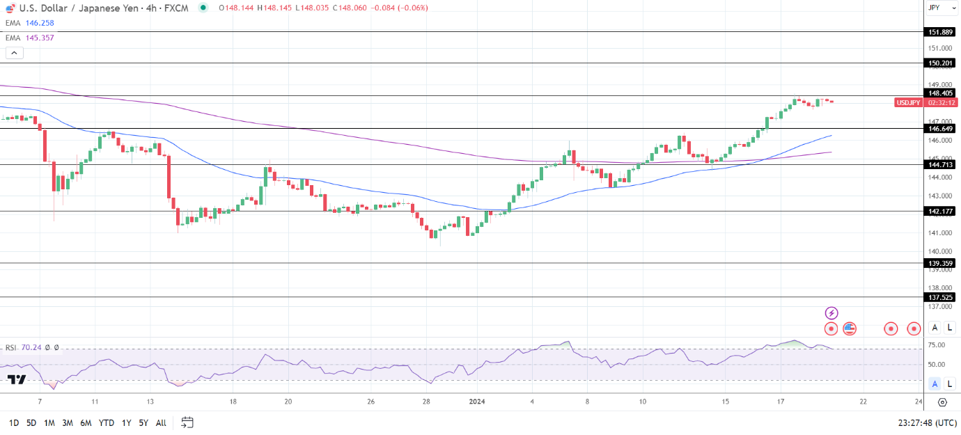 14天RSI为65.57,表明美元/日元在进入超买区域之前将突破148.405阻力位。