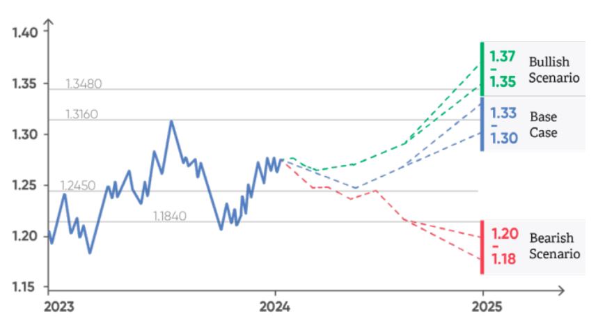 Argentex对2024年英镑兑美元汇率的基本情景预测表明,随着美元走弱,英镑将继续保持其最近的韧性,逐步上涨。